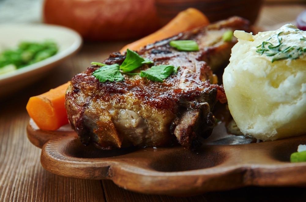 The skin cooks along with meat resulting in a tasty crackling crust around each slice of pork. To complete the meal, it’s served with boiled or butter-sauteed potatoes and a white sauce.